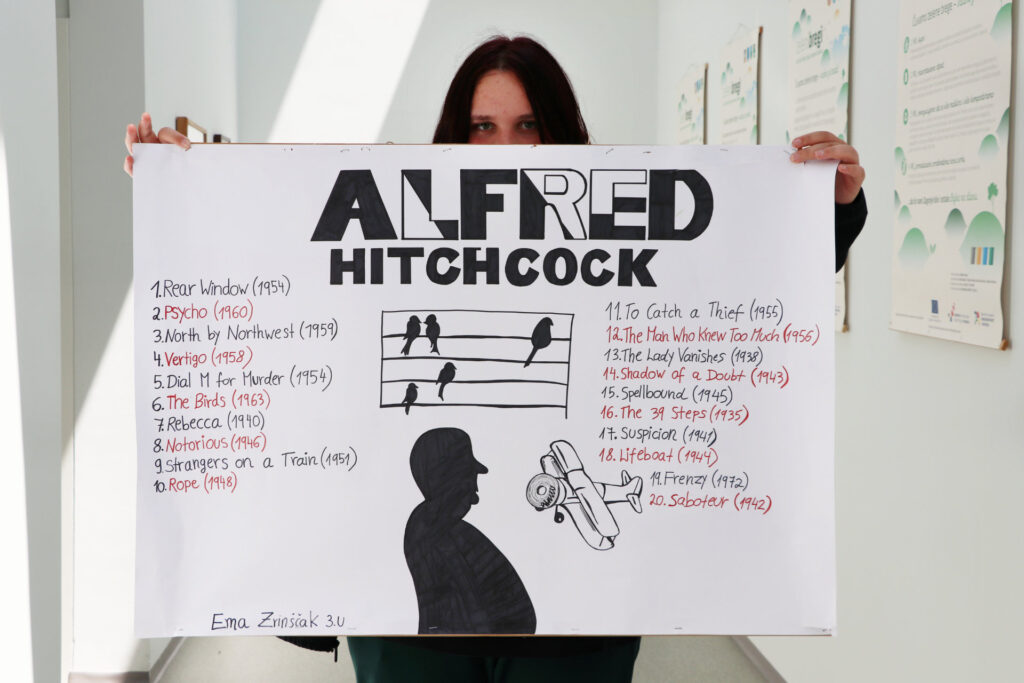 Na svome sam plakatu nabrojila veći dio filmskog opusa velikog britanskog redatelja te pisca krimića i horora, koji je nosio počasnu titulu sir. Osim što je svojim filmovima stekao ogromnu popularnost kod gledatelja i filmskih kritičara, smatra se i jednim od vrhunskih eksperimentatora u sedmoj umjetnosti. Naime, od tipičnih žanrovski predodređenih krimića i trilera, uspio je stvoriti filmove pune napetosti svojim vještim poigravanjem filmskim stilskim sredstvima. Mnogi gledatelji kažu da nisu sigurni što ih više plaši – radnja ili atmosfera filmova. Posebnu je pozornost posvećivao psihičkoj nestabilnosti glavnih likova u svojim filmovima pa se pokazao i kao dobar poznavatelj poigravanja ljudskom psihom.