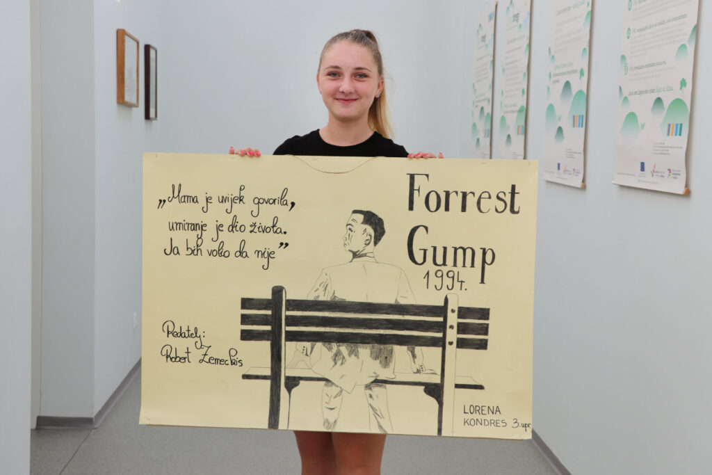Forrset Gump ime je filma koji krasi moj plakat. Film je američka drama i komedija, snimljena 1994. godine, uglavnom u Georgiji te Sjevernoj i Južnoj Karolini. U središte plakata smjestila sam glavnog lika Forresta, koji pomiče sve granice svojih sposobnosti i postaje prava zvijezda unatoč poteškoćama koje je imao u razvoju. Film je zasnovan na istoimenom romanu Winstona Grooma koji nije potpunopodudaran s filmom, a režirao ga je Robert Zemeckis. U namjeri da vas potaknem na čitanje knjige ili gledanje filma, prikazat ću elemente radnje filma i ideju. Naime, Forrest Gump bio je drugačiji od ostalih. Još kao dječak imao je poteškoće u razvoju, svi bi mu se izrugivali i vrijeđali ga. Jenny je bila jedina prijateljica koju je Forrest imao, a kasnije postaje njegovom suprugom. Nakon završetka školovanja Forrest postaje junak, pa čak i u povijesnim granicama.